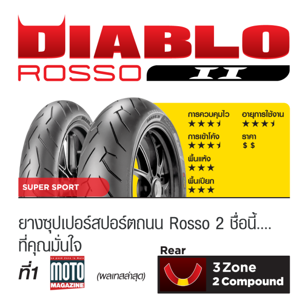 - A 2-compound rear tire that combines long-lasting durability with excellent grip in one tire.