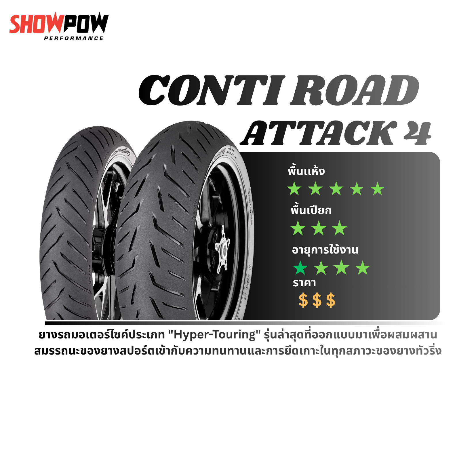 - Hyper-Touring Performance: ผสมผสานความทนทานและการรีดน้ำของยางทัวร์ริ่ง เข้ากับความหนึบและการควบคุมที่แม่นยำแบบยางสปอร์ต